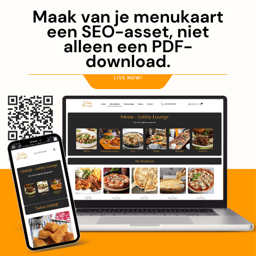 Voor restaurants, cafés, kebabzaken en lounges die hun menu in seconden willen tonen op mobiel, met een structuur die later kan doorgroeien naar lokale SEO en content. Je krijgt een basis die werkt in de zaak en in Google.