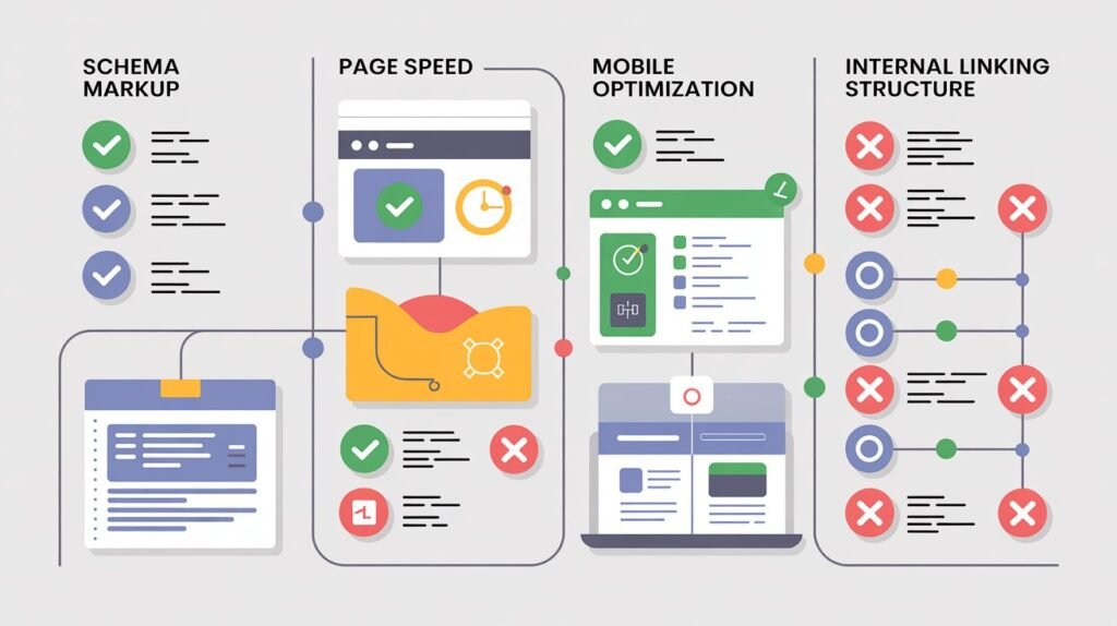 Geen schema markup: Je site vertelt Google niet expliciet wat je aanbieding is. Geen duidelijke entiteit-structuur (wie ben je? Wat doe je? Waar ben je actief?). Slechte site-architectuur: Pagina’s zijn willekeurig georganiseerd in plaats van rond logische thema’s. Traag laadtijden op mobiel: Core Web Vitals zijn slecht, wat zowel SEO als conversie saboteert. Geen interne linking strategie: Bezoekers en Google weten niet hoe je informatie samenhangt.